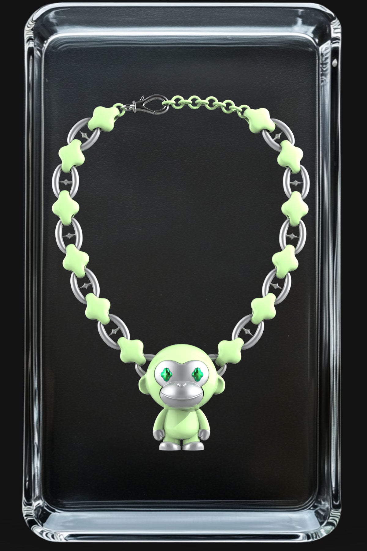 A vibrant detail brings the Space Monkey to life: its eyes are coated with a colored glitter enamel, adding a playful sparkle and depth to its expression.