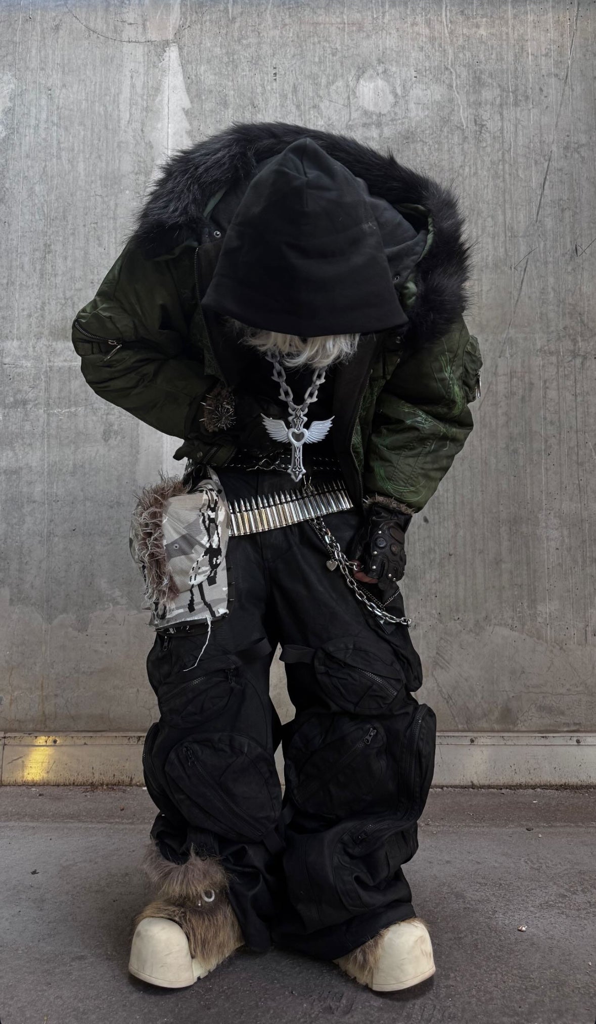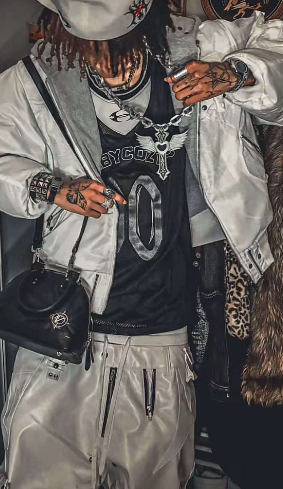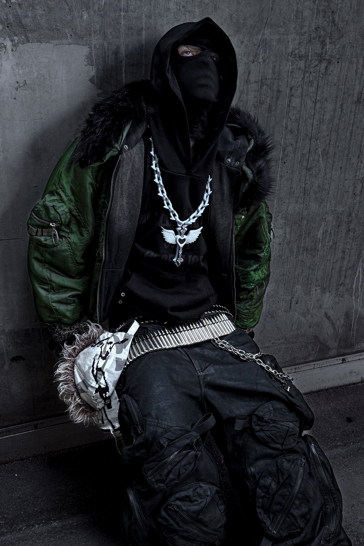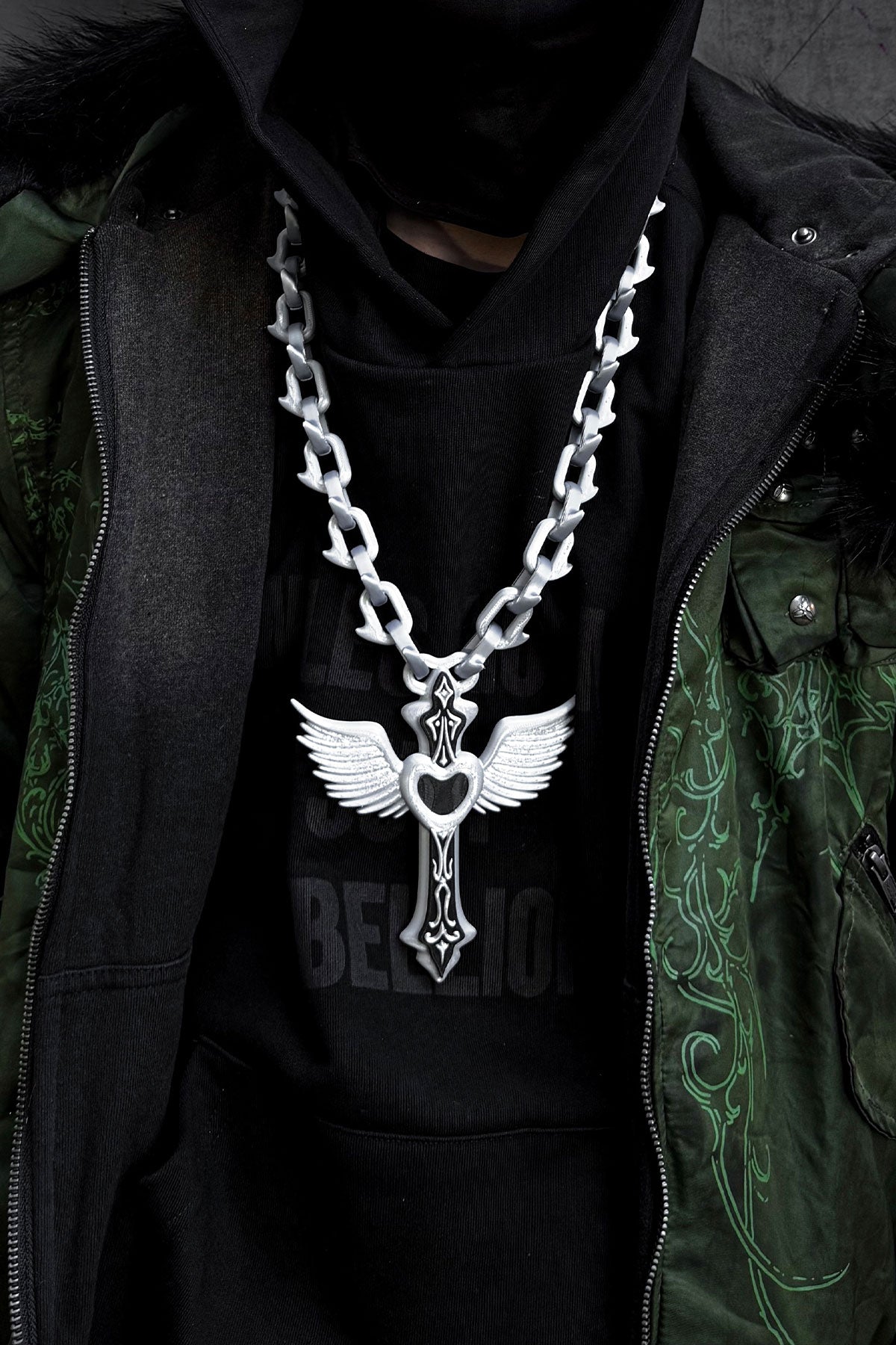 Crafted with high-precision 3D printing, this unique piece blends a cross and winged design with a sleek metallic finish, perfect for fans of fantasy aesthetics, symbolic jewelry and avant-garde fashion.